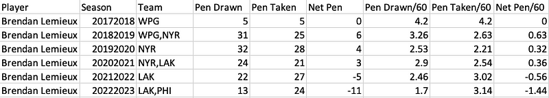 That said, it has to be assumed that the team has more in mind for Lemieux than just fighting — this isn’t 1987. So, what else can a player like Lemieux bring to the Canes? Lemieux’s playing style is generously described as a “pest”, meant to frustrate players and make them take bad penalties, and sure enough — Lemieux draws penalties. This season, Sebastian Aho drew an average of 1.27 penalties per 60 minutes played, which was the second-best mark for the team during the Brind’Amour playoff era (Warren Foegele drew an amazing 2.00 penalties per 60 during his first full season — a number he hasn’t seen since.) Lemieux in his career draws an average of 2.63 penalties per 60 — more than twice Aho’s number. Even last season — arguably the worst of Lemieux’s career — he drew 1.7 per 60.