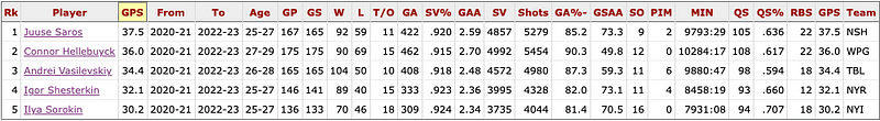 As for Saros, there’s some grumbling that he “hasn’t been great” this season, but you have to remember Nashville’s defense is Roman Josi, Ryan McDonagh, a radio contest winner and several children in a trenchcoat. In his first three seasons as a #1 goaltender after the retirement of Pekka Rinne, Saros finished in the top 6 for the Vezina Trophy all three seasons, and received Hart votes in two of those three seasons. One could argue that Saros was the top goaltender in the NHL during that time, and even if you don’t want to accept that, that’s some impressive company to keep: